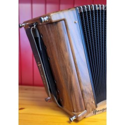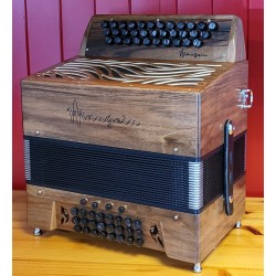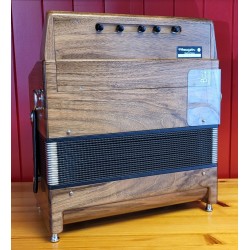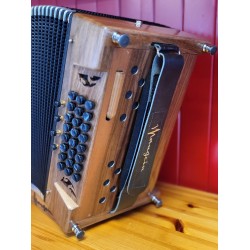 Diatonique haut de gamme. 3 rangs, 3 voix main droite, 5 registres. 24 basses, 2 voix main gauche, 4 registres.