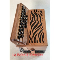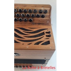 Diatonique haut de gamme, 2 rangs 1/2 (23 boutons + 5) 2 voix "bando" à la main droite (flûte/ basson) 3 registres : 1)flûte, 2)basson, 3) bandonéon. 12 basses 3 voix à la main gauche aux basses et accords sans tierces.