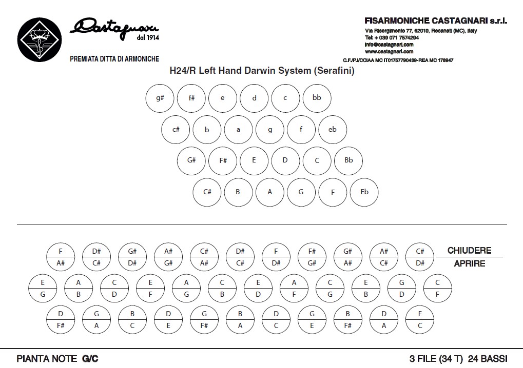 Diatonique 3 rangs, 34 touches, 2 voix main droite. Main gauche clavier Darwin 24 basses, 2 voix aux basses 2 aux accords, 4 registres Main gauche, 1 sur chaque voix.