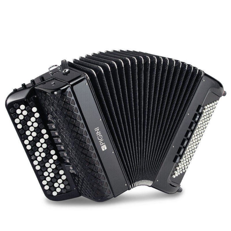 Accordéon chromatique avec convertisseur. 5 rangs , 3 (16+8+4) voix à la main droite, 7 registres, 4 mentonnières (voix possibles : voir rubrique "Description" ci-dessous), 102 basses à la main gauche, 2 voix (16+8) 3 registres en basses chromatiques, 4 voix, 7 registres en basses standards, avec convertisseur.