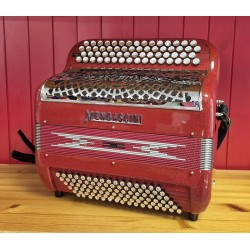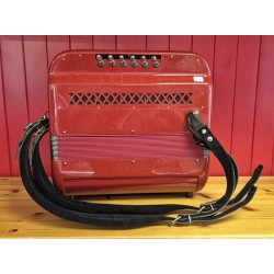 Mengascini F5, accordéon chromatique Main droite: 4 rangs, 66 boutons (50 notes), 3 voix, 6 registres 5 effets, accordé Musette Main gauche: 6 rangs, 96 basses en 3/3, 4 voix.