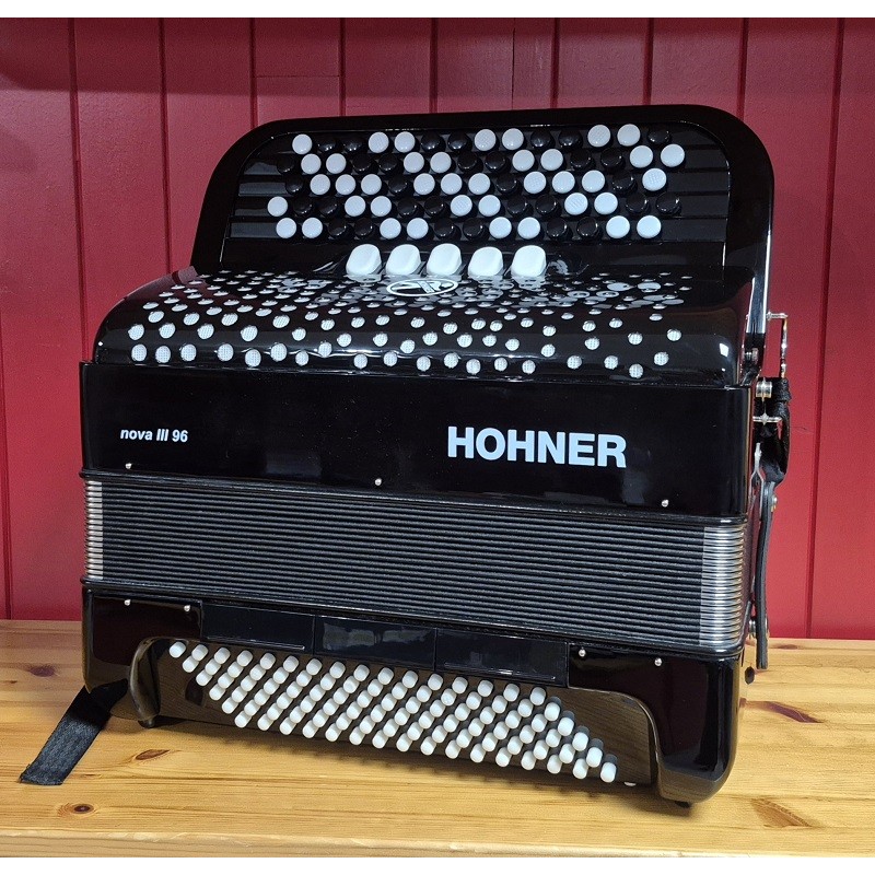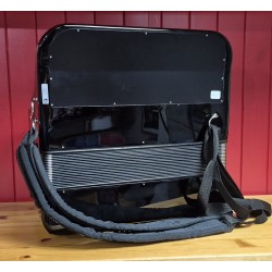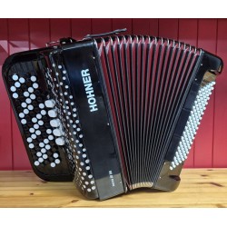 Accordéon chromatique, anches "export", main droite 5 rangs, 72 boutons (43 notes), 3 voix, 5 registres (MD), accordé céleste. 6 rangs, 96 basses, en 2/4, 4 voix, 2 registres (MG).