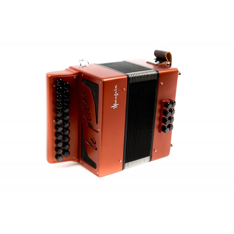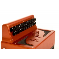 Diatonique de petit format, 2 rangs 1 voix à la main droite, 8 basses 2 voix à la main gauche.